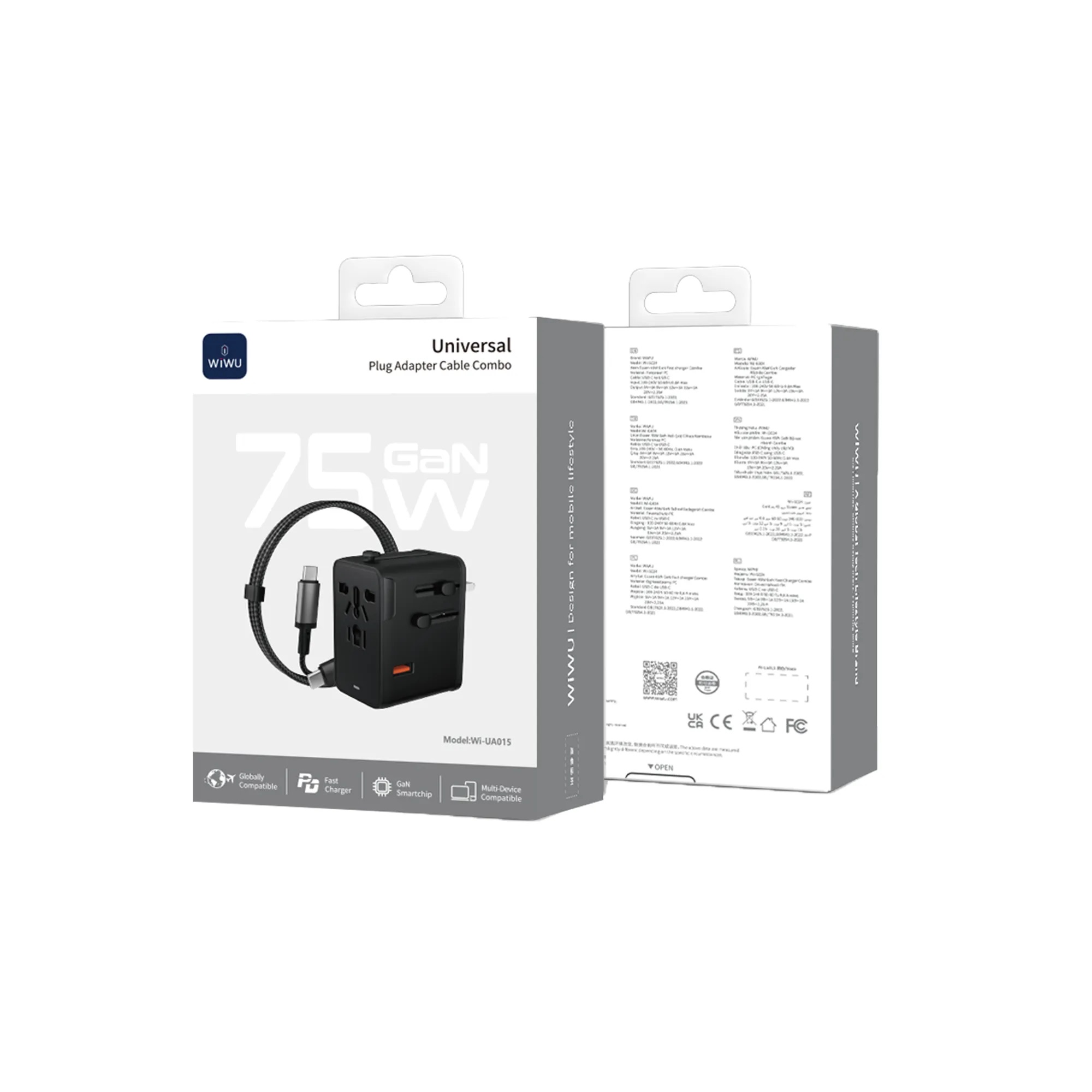 WiWU WI-UA015 вирізняється ультракомпактним і портативним дизайном для глобальних подорожей, з корпусом із вогнестійкого PC V-0 матеріалу, що забезпечує високу міцність, безпеку та приємну тактильність. Пристрій оснащений змінними вилками (interchangeable pins) для адаптації під різні стандарти, а також комбінованим універсальним розетковим гніздом, яке приймає штекери типів A, B, C, D, E, F, G, H, I, J, L, N, O. У комплекті йде 1-метровий кабель USB-C to USB-C на 60 Вт з алюмінієвим сплавом, нейлоновою обплеткою та посиленими антирозривними терміналами — не потрібно носити додаткові дроти. Завдяки GaN-технології адаптер залишається маленьким і легким, ідеально підходить для подорожей, бізнесу та щоденного використання в будь-якій країні.