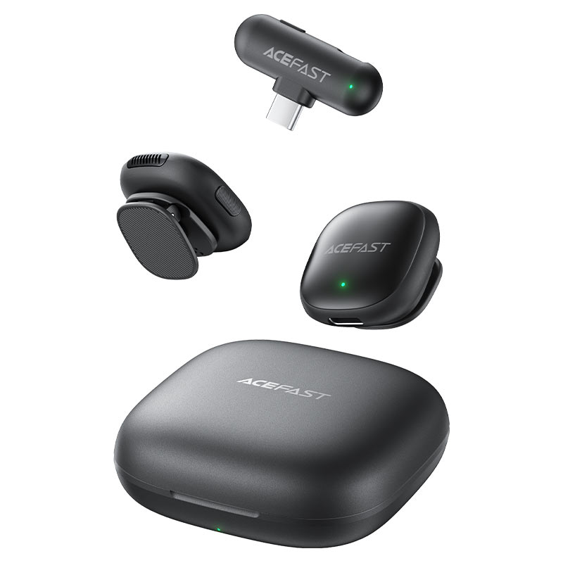 R1 має ультракомпактний і легкий дизайн: весь комплект важить лише 91 г, а зарядний кейс розміром 78 × 78 × 28 мм легко поміщається в кишеню чи сумку — ідеально для мобільних зйомок, подорожей чи щоденного використання. Корпус виконаний з міцного ABS-пластику, стійкого до подряпин і щоденного навантаження. Магнітне або кліпсове кріплення (залежно від комплектації) дозволяє швидко фіксувати мікрофони на одязі без зайвих дротів. Ресивер компактний і функціональний з портом для зарядки. Мінімалістичний стиль AceFast — матовий чорний колір, елегантні форми та практичність — підкреслюють сучасність і професійність пристрою для контенту-креаторів.