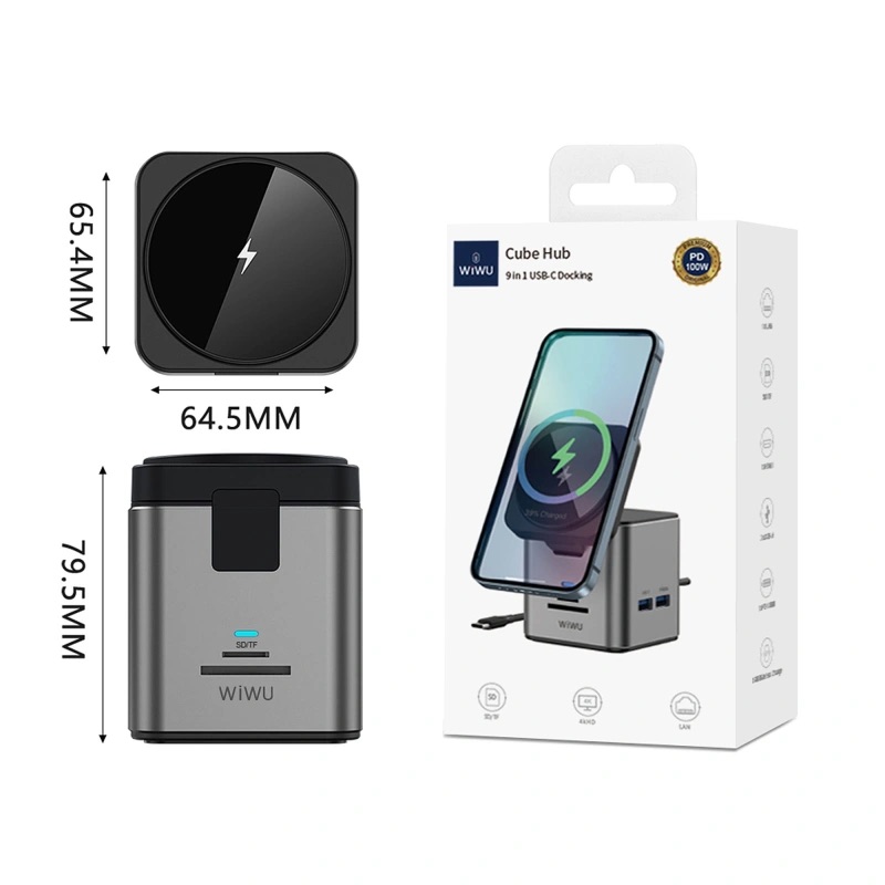 Док-станція WIWU [Wi-W025] Cube Hub Wireless Charger 9in1 USB-C to 3xUSB3.0+HDMI+RJ45+SD/MicroSD+PD 100W